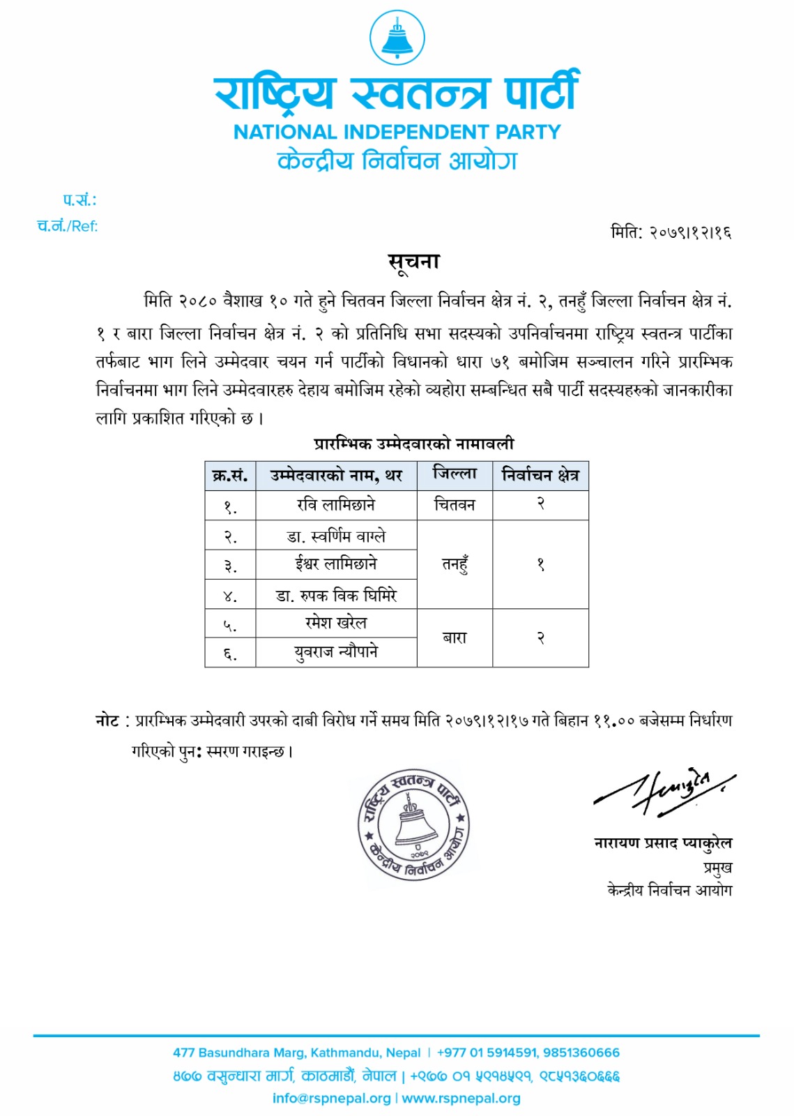 बिहीबार राति रास्वपाले सार्वजनिक गरेको सूचीअनुसार चितवन–२ मा पार्टी सभापति रवि लामिछानेको एकल नाम छ । तनहुँ–१ का लागि स्वर्णिम वाग्लेसहित ईश्वर लामिछाने र डा.रूपक बिक घिमिरे को नाम छ ।