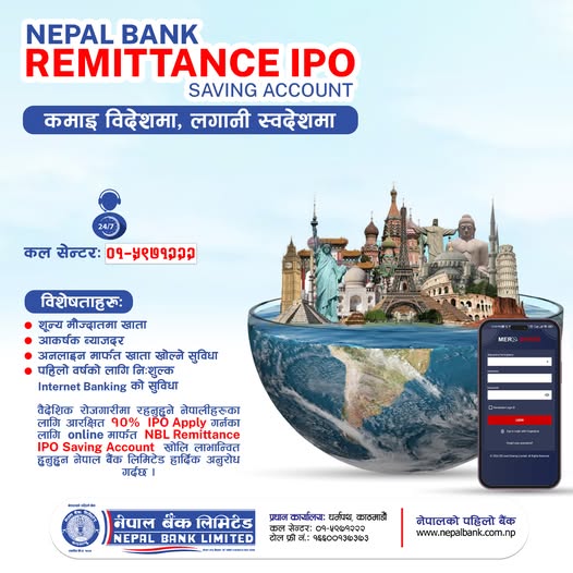 विदेशिएका नेपालीका लागि नेपाल बैंकको ‘रिमिटेन्स आईपीओ सेभिङ खाता’, आजै अनलाइनमार्फत खोल्न सकिने