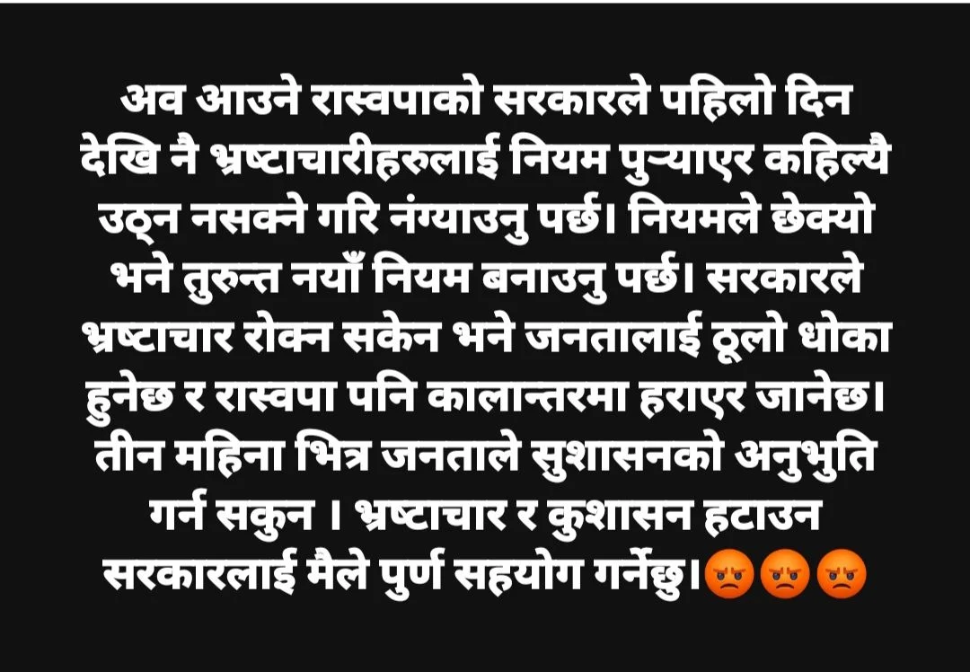 उनले जनताले छोटो समयमै राम्रो शासनको अनुभूति गर्नुपर्ने बताउँदै, भ्रष्टाचार र खराब व्यवस्थाविरुद्ध सरकारले काम गरे आफूले पूर्ण सहयोग गर्ने पनि बताएका छन्।