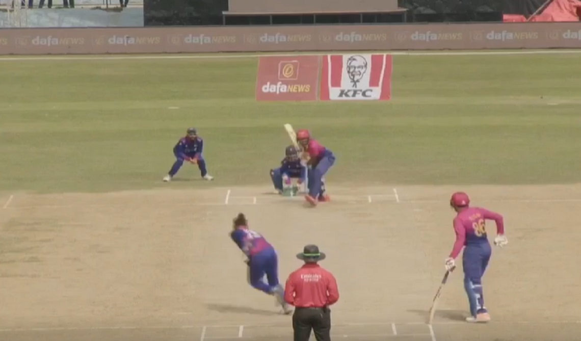 त्रिवि मैदानमा जारी खेलमा यूएईका कप्तान मोहम्मद वासिमलाई आउट गर्दै नेपालका लागि सन्दीप लामिछानेले दोस्रो विकेट लिएका हुन्।