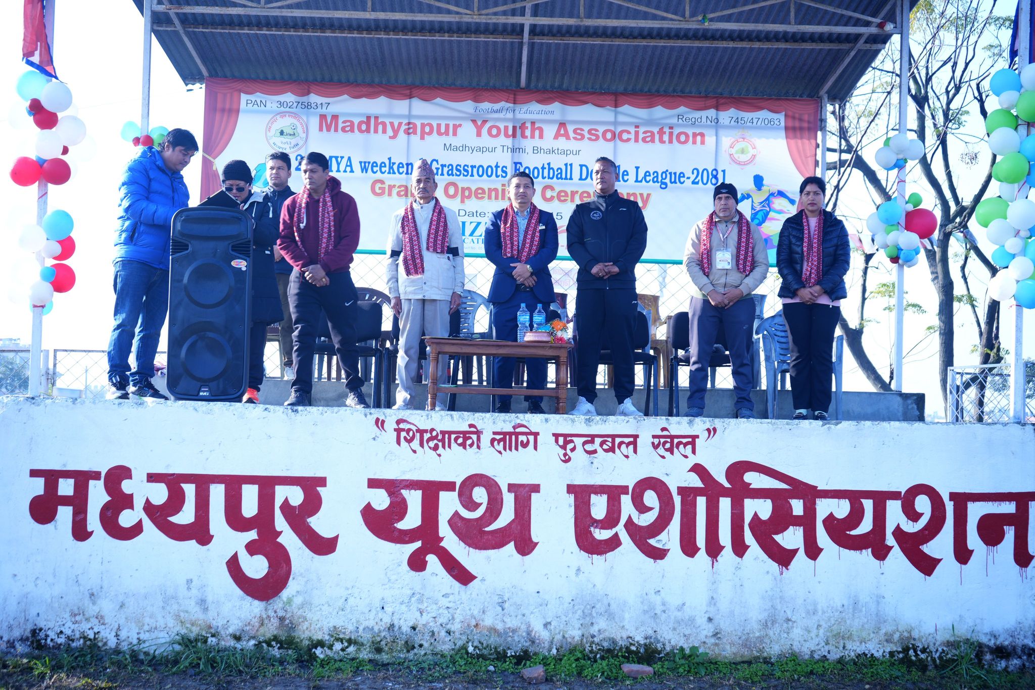 भक्तपुर ।मध्यपुर ठिमी, भक्तपुर – मध्यपुर युवा संघको आयोजनामा ‘दोस्रो साप्ताहिक ग्रासरुट फुटबल डबल लिग २०८१’ को भव्य उद्घाटन कार्यक्रम सम्पन्न भएको छ। मध्यपुर युवा संघका अध्यक्ष उपेन्द्र मान सिंहले उद्घाटन समारोहमा बोल्दै युवा पुस्तालाई मोबाइलमा समय बर्बाद नगरी खेलकुदमा सहभागी हुन प्रेरित गर्न आग्रह गरे।