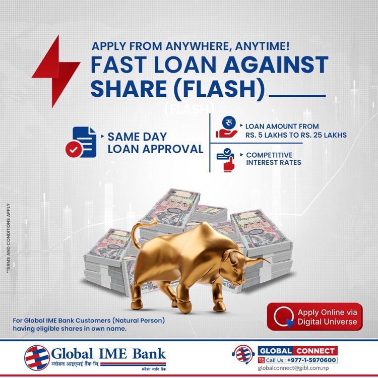 काठमाण्डौ । ग्लोबल आइएमई बैंक लिमिटेडले फास्ट लोन अगेन्स्ट शेयर प्लेटफर्म सार्वजनिक गरेको छ । यसअन्तर्गत इच्छुक महानुभावहरुले अनलाइनबाट सेयर धितो कर्जाको लागि आवेदन दिन सक्नेछन् ।