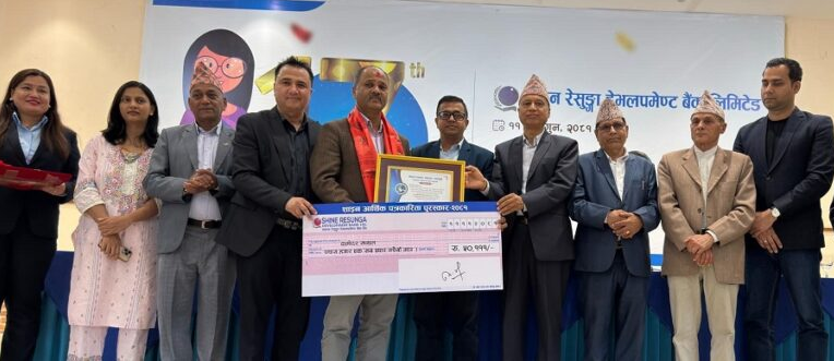 काठमाडौँ । रुपन्देहीको बुटवलमा केन्द्रीय कार्यालय रहेको शाईन रेसुङ्गा बैंक १७ औं वर्षमा प्रवेश गरेको छ । स्थापना दिवसको अवसर पारेर बैंकले आफ्ना उत्कृृष्ट शाखा तथा आर्थिक बिटमा कलम चलाउने पत्रकारलाई पुरस्कृत गरेको छ । आइतबार मणिग्राममा एक कार्यक्रमको आयोजना गरी बैंकले बार्षिकोत्सवको मूल कार्यक्रम सम्पन्न गरेको छ । बैंकले उत्कृष्ट व्यवस्थित शाखा पुरस्कारबाट बर्दिया जिल्लाको कतरनिया शाखा, गुल्मी जिल्लाको खैलेनी शाखा, प्युठान जिल्लाको विजुवार शाखा, रुपन्देही जिल्लाको सूर्यपुरा र योगीकुटी शाखालाई “बेष्ट म्यानेज्ड ब्रान्च अवार्ड” बाट सम्मानित गरेको छ ।