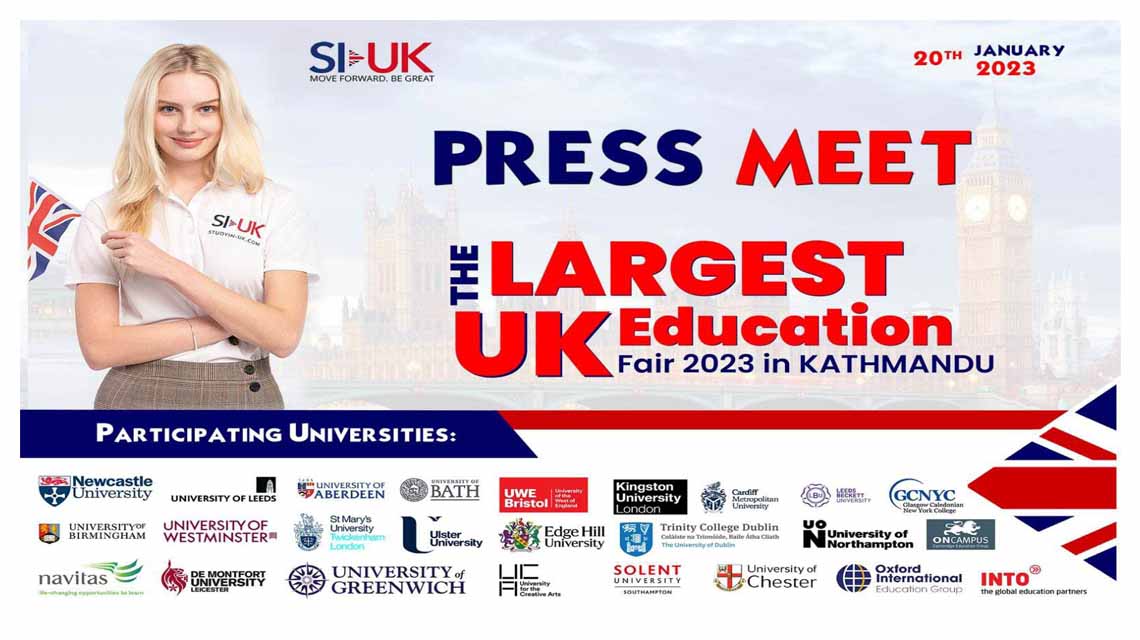 एसआई-युकेले फेब्रुअरी ४ र ५ मा युके एजुकेशन फेयर आयोजना गर्दै छ। मेला फेब्रुअरी ४ मा राजधानीको होटल र्याडिसनमा र फेब्रुअरी ५ गते पोखराको सिटी स्क्वायरमा हुने आयोजकले जनाएको छ ।