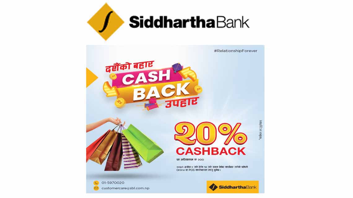 • काठमाडौँ , ९ असोज । सिद्धार्थ बैंक लिमिटेडले दशैंको अवसरमा ग्राहकलाई लक्षित गर्दै ‘दशैंको बहार, क्यासब्याक उपहार’ योजना ल्याएको छ ।