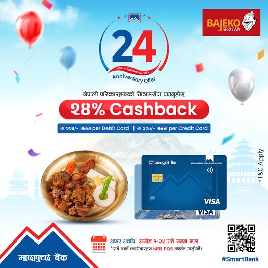 • काठमाडौं, २०८१ असोज १ – माछापुच्छ्रे बैंकले आफ्नो २४औं वार्षिकोत्सवको अवसरमा विशेष नगद फिर्ता अफर प्रस्तुत गरेको छ। यस अफर अन्तर्गत, ग्राहकहरुले माछापुच्छ्रे बैंकको कार्ड प्रयोग गरेर बाजेको सेकुवामा विभिन्न स्वादिलो परिकारको मजा लिँदै २४% नगद फिर्ता प्राप्त गर्न सक्नेछन्।