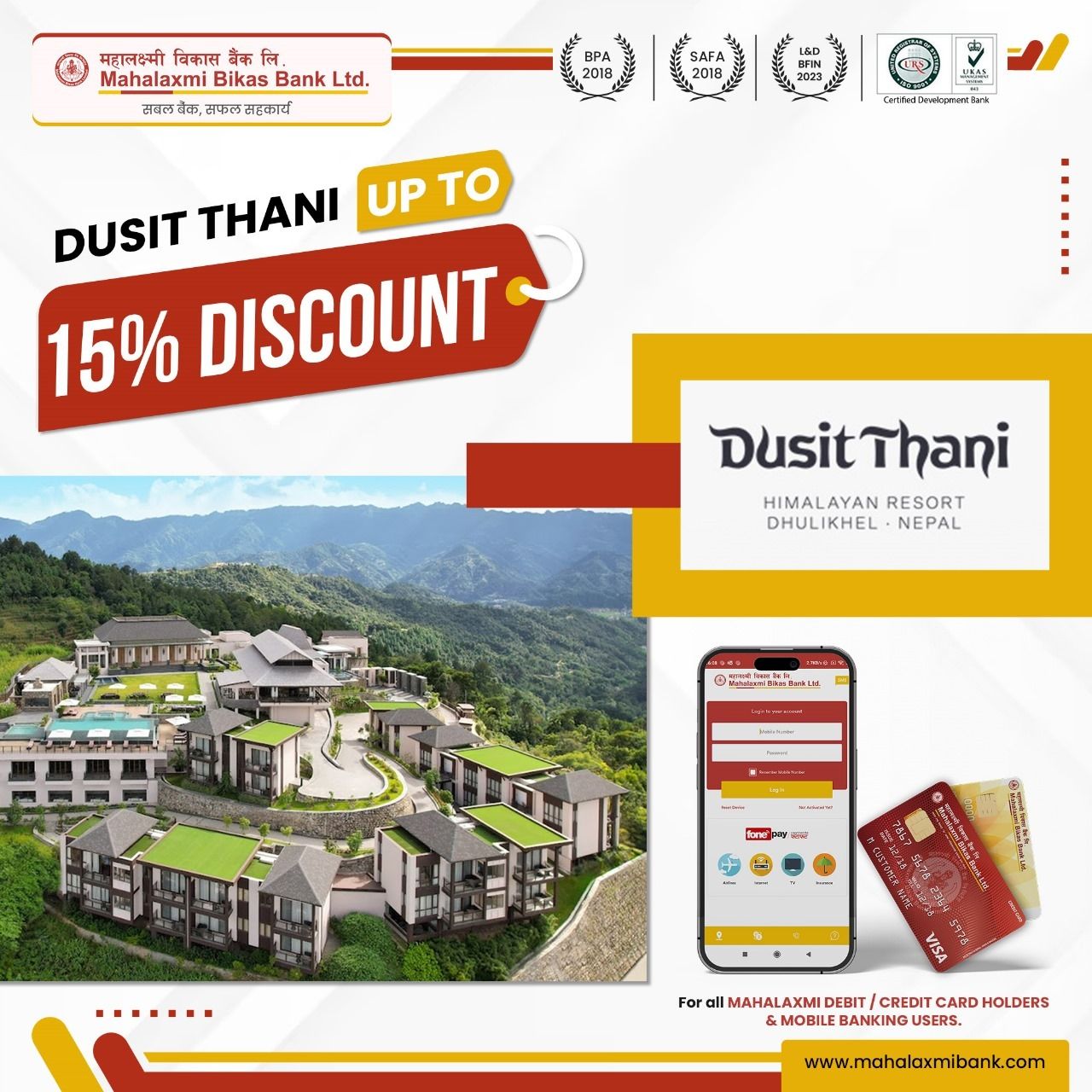काठमाडौं, २६ भदौ – दुषित थाना हिमालयन रिसोर्टले हाल एक विशेष प्रस्ताव प्रस्तुत गरेको छ, जसमा ग्राहकहरूले विभिन्न सेवामा १५% छुट प्राप्त गर्न सक्छन्। यो प्रस्ताव महालक्ष्मी डेबिट/क्रेडिट कार्डधारक र मोबाइल बैंकिङ प्रयोगकर्ताहरूका लागि मान्य छ।