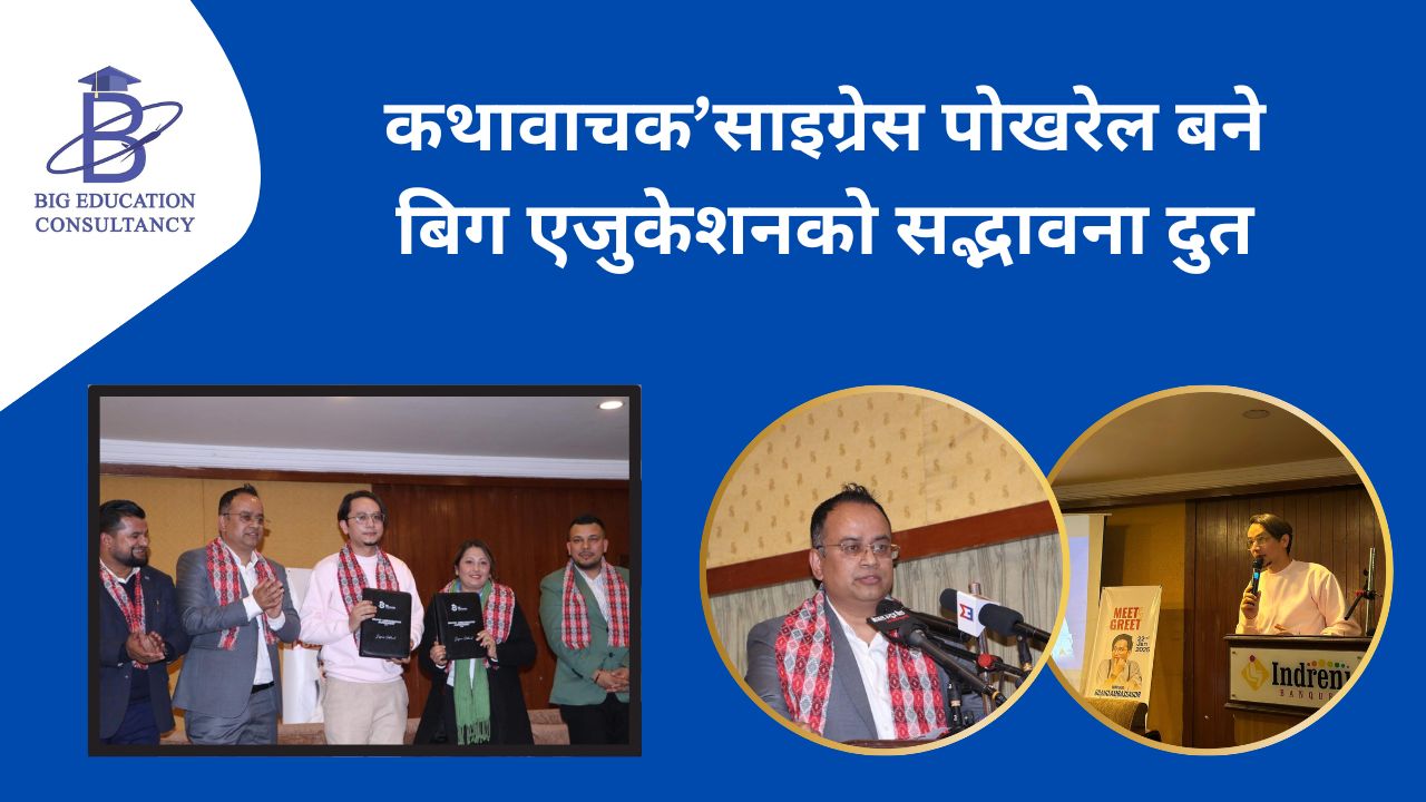 काठमाडौं । बिग एजुकेशन कन्सल्टेन्सीले ‘कथावाचक’साइग्रेस पोखरेलसँग ब्रान्ड एम्बेस्डर साझेदारीको घोषणा गरेको छ । बुधबार काठमाडौंमा आयोजित एक कार्यक्रमकाबीच ‘कथावाचक’साइग्रेसले ब्रान्ड एम्बेसडरका रुपमा कन्सल्टेन्सीको एमओयू हस्ताक्षर गरेका हुन् ।