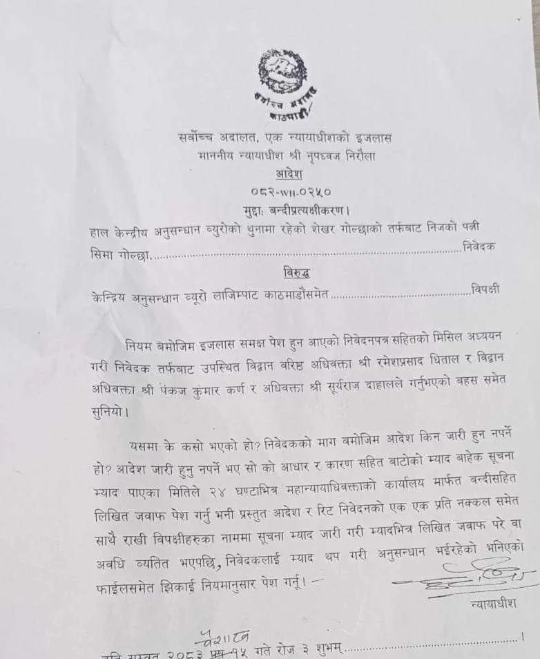 न्यायाधीश नृपध्वज निरौलाको एकल इजलासले बन्दीप्रत्यक्षीकरण रिटमाथि सुनुवाइ गर्दै यस्तो आदेश दिएको हो। गोल्छाकी पत्नी सीमा गोल्छाले उनलाई गैरकानुनी रूपमा थुनामा राखिएको भन्दै अदालतमा रिट दायर गरेकी थिइन्।