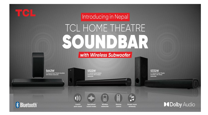 टिसीएलका एस ६४३ डब्लु ,एस ५२२ डब्लु र एस ३३२डब्लु गरि ३ मोडलका साउन्डबारहरु नेपाली बजारमा उपलब्ध छन्।अब सहज रूपमा आफ्ना हरेक डिभाइस सँग टिसीएलका साउन्डबार जोडी कुनै झन्झट बिना आफ्नो मनपर्ने धुनहरूको आनन्द लिन मिल्छ।