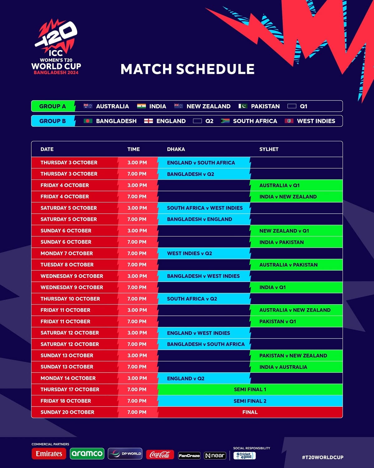 भारत, अष्ट्रेलिया, न्यूजिल्यान्ड, पाकिस्तान र क्वालिफायर–१ को टिम समूह ‘ए’ मा छन् ।