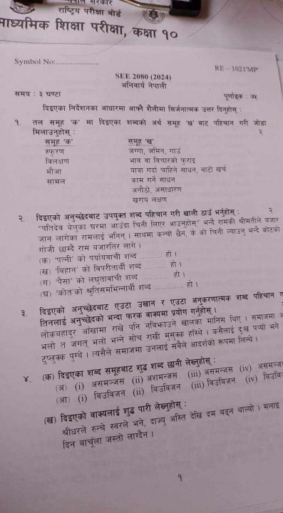 • काठमाडौँ, १६ चैत । सिराहमा एसइईको नेपाली विषयको प्रश्न पत्र बाहिरिएको छ । परीक्षा सुरु भएको १० मिनेट पछि नै नेपाली विषयको प्रश्न पत्र बजारमा भेटिएको हो । चिट बनाउनका लागि प्रश्नपत्र बजारमा भेटिएको हो ।