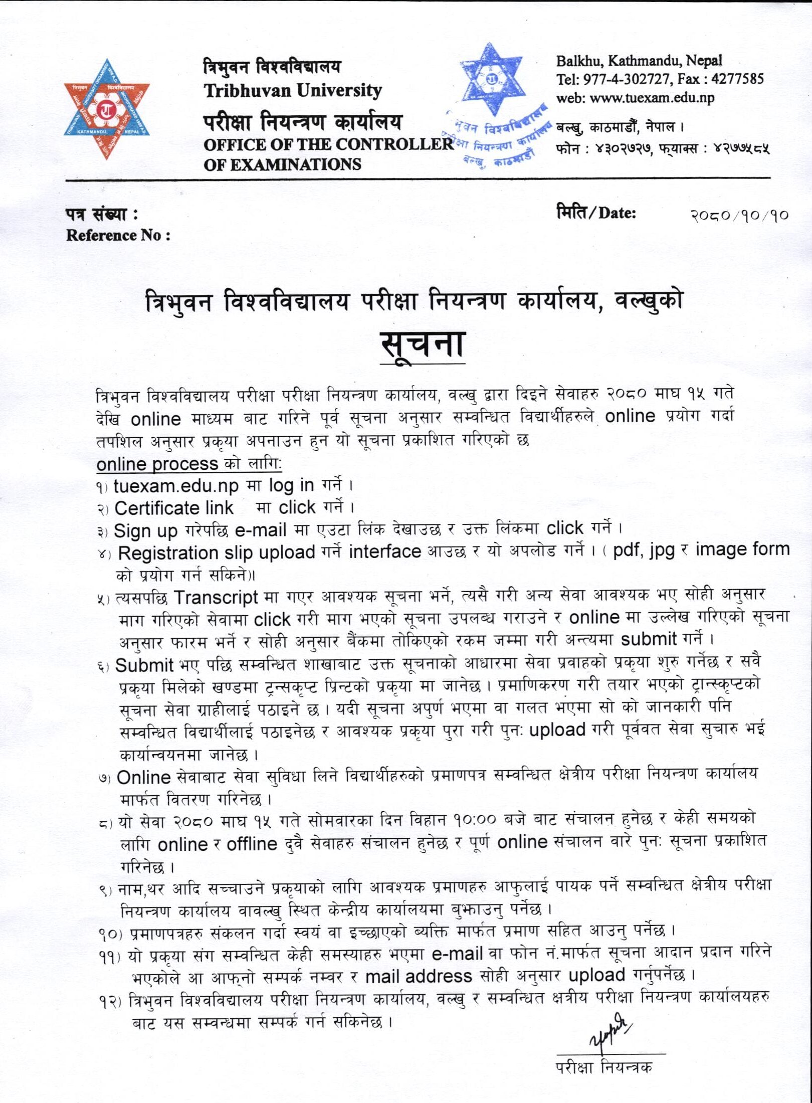 काठमाडौँ, १५ माघ । भुवन विश्वविद्यालयले आजदेखि ट्रान्सक्रिप्ट, प्रोभिजनल प्रमाणपत्र, पुनर्योग, प्रतिलिपि र करेक्सनलगायत सेवा अनलाइनबाट दिने भएको छ ।