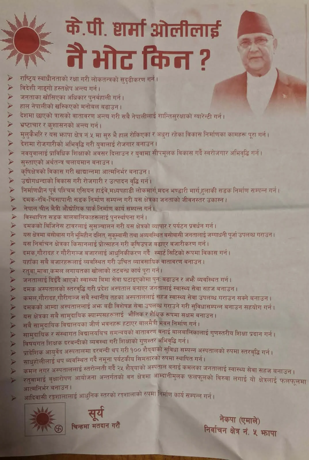 काठमाडौँ । नेकपा एमालेले पार्टी अध्यक्ष केपी शर्मा ओली लाई मत हाल्नुपर्ने ३० कारण सार्वजनिक गरेको छ। झापा निर्वाचन क्षेत्र नं. ५ को क्षेत्रीय कमिटीले प्रकाशित गरेको अपिलमार्फत ‘ओलीलाई नै भोट किन?’ भन्ने शीर्षकमा ती कारणहरू प्रस्तुत गरिएको हो।