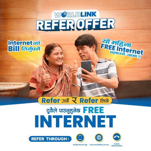 यस योजनामा भाग लिन, ग्राहकहरूले आफ्ना साथीलाई वर्ल्डलिंक इन्टरनेट सेवा रिफर गर्न सक्छन्। यसका परिणामस्वरूप, रिफर गर्ने र रिफर लिने दुवैले समान रूपमा ६० दिनको FREE Internet पाउनेछन्। यो अवसर सबै ग्राहकका लागि उपलब्ध छ जसले वर्ल्डलिंक इन्टरनेटका सेवाहरू प्रयोग गर्दै आएका छन्।